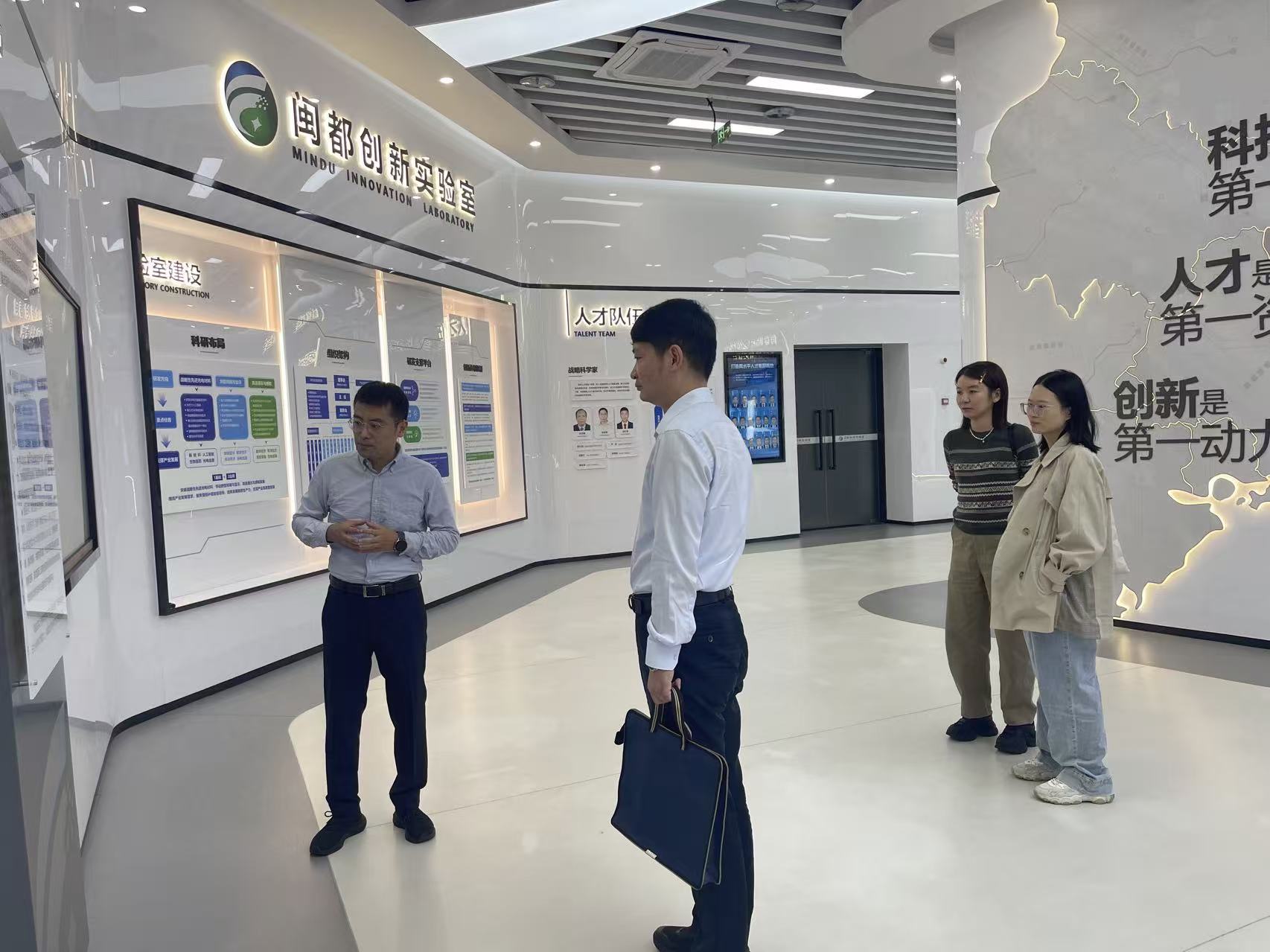 10月22日下午,福建省闽招产业投资基金管理有限公司总经理施丽雄、总经理助理郑秀钗,福州市创业投资有限责任公司副总经理唐静文,到闽都创新实验室调研并座谈交流。实验室副主任郑发鲲,成果转化部、闽都科发公司相关负责人陪同调研。