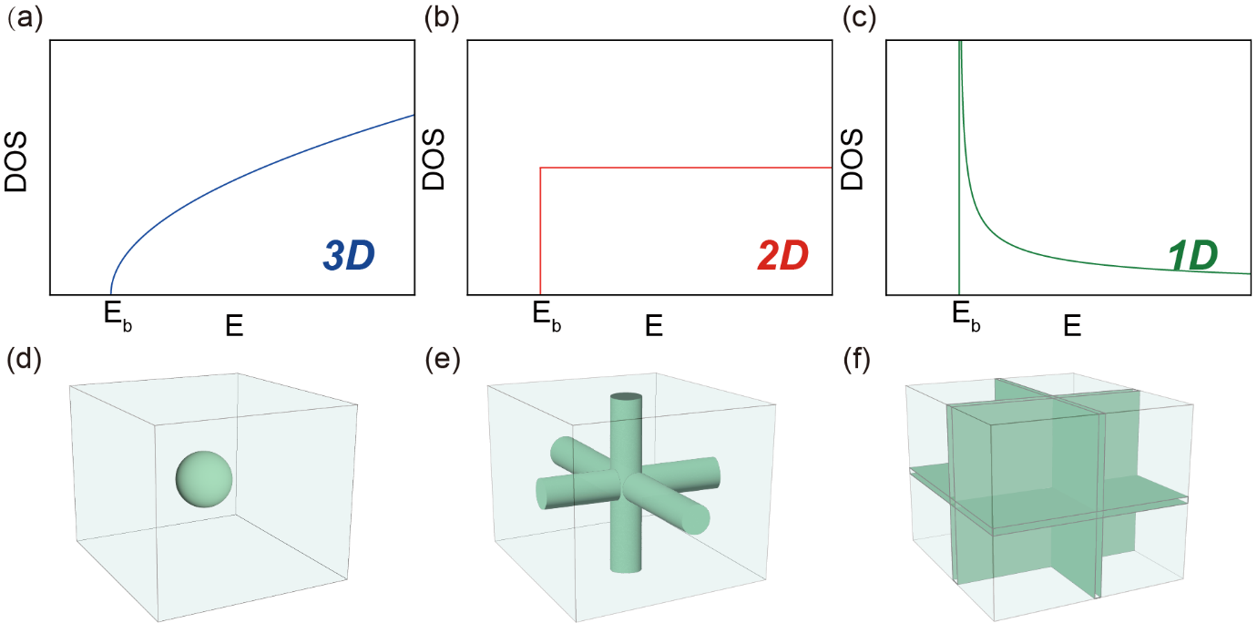 图1:不同维度体系的电子态密度(上排)与对应费米面(下排)示意图。