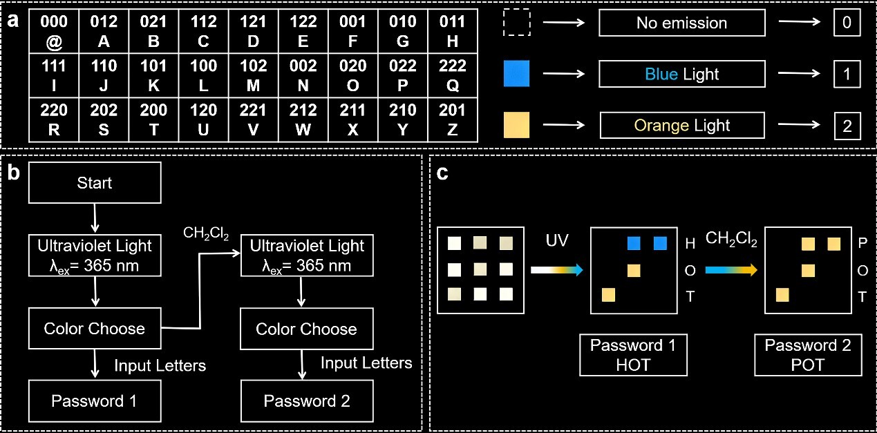 此外,基于1和2溶剂驱动的可逆结构转变与发光转换特性,研究团队还构建了一种多级信息加密系统。通过将三种发光状态分别编码为“0”、“1”、“2”三种信号,实现了对26个字母及符号“@”的动态加密与解密,显著提升了信息存储与防伪的安全性。