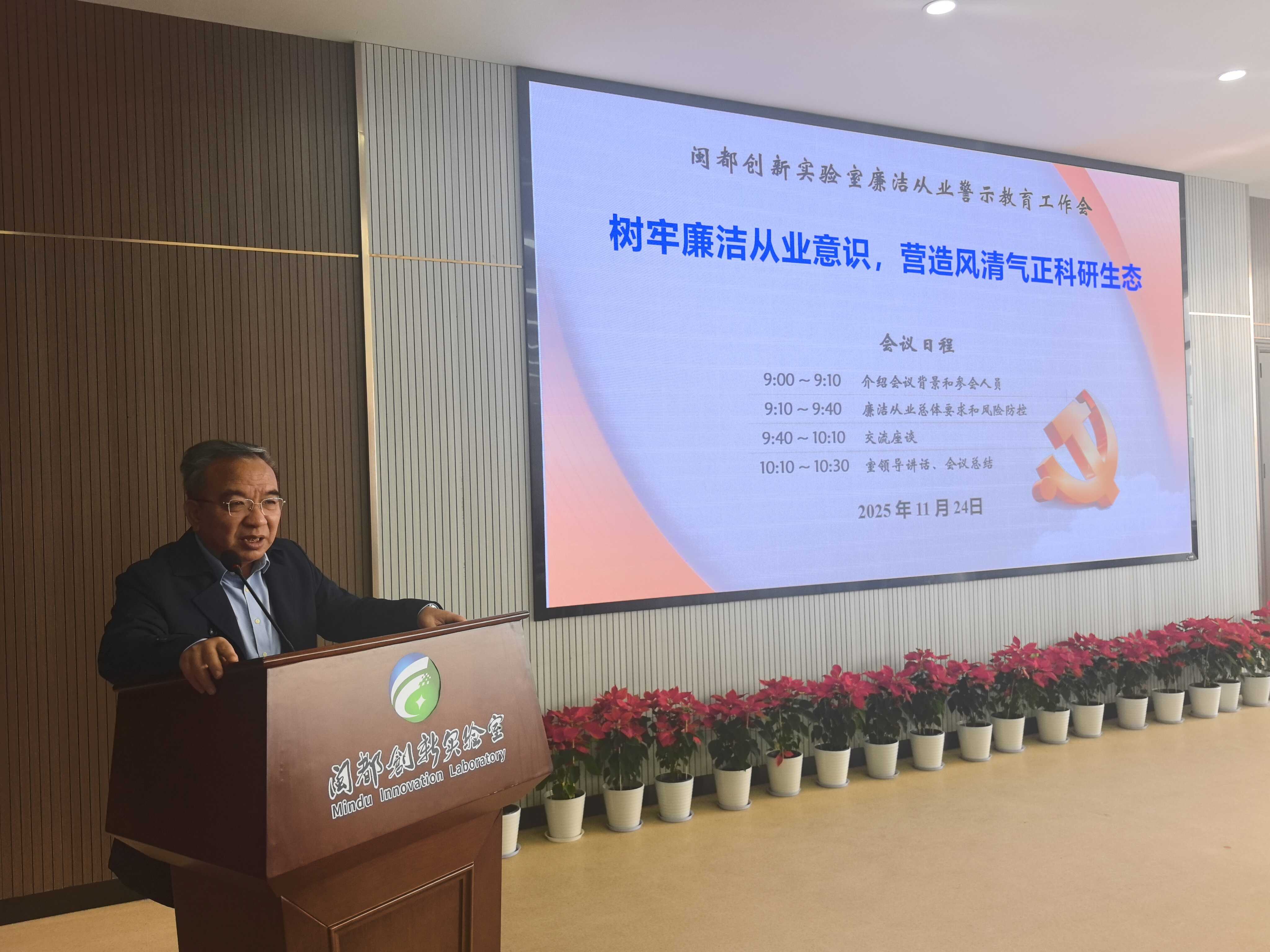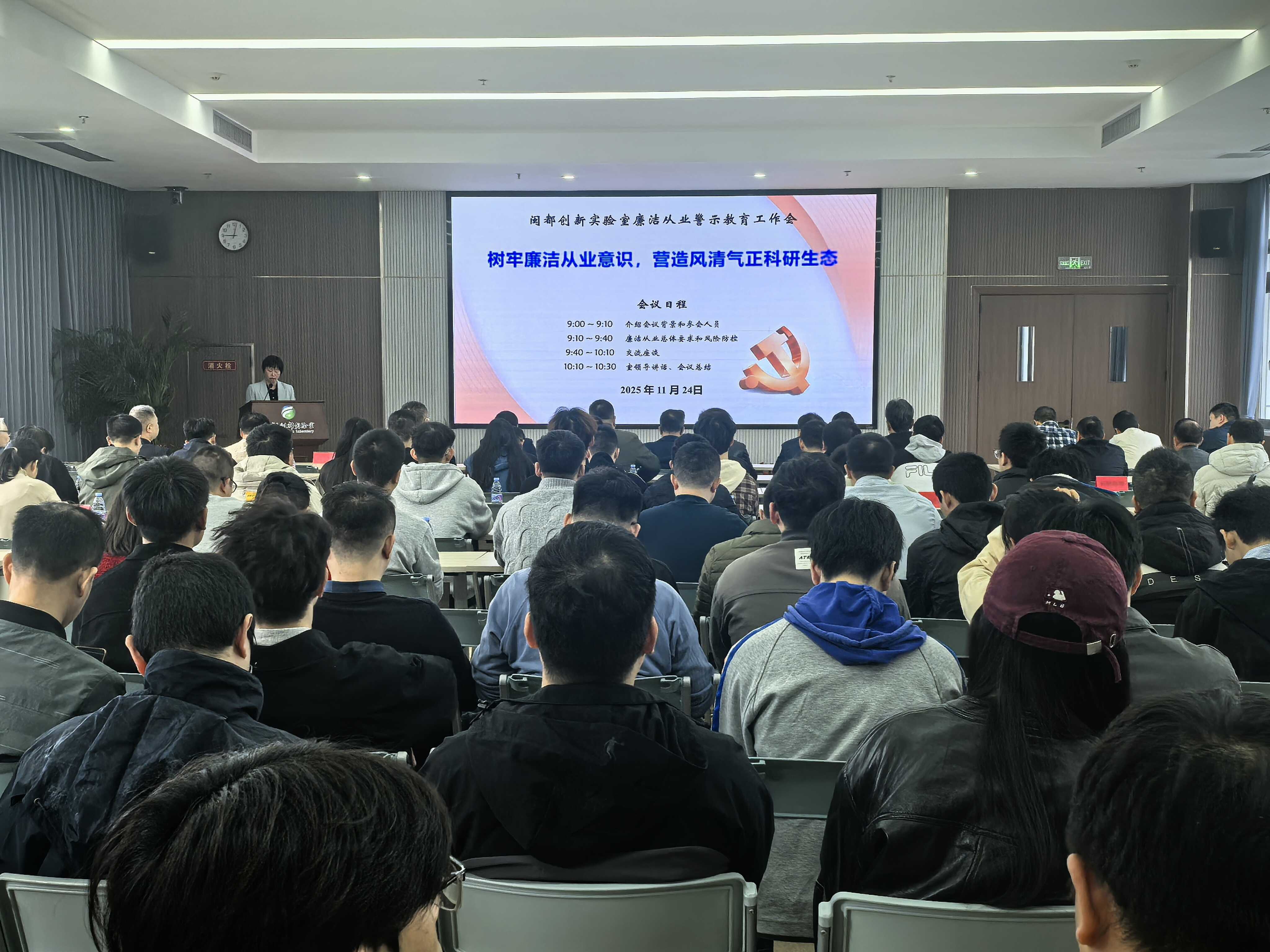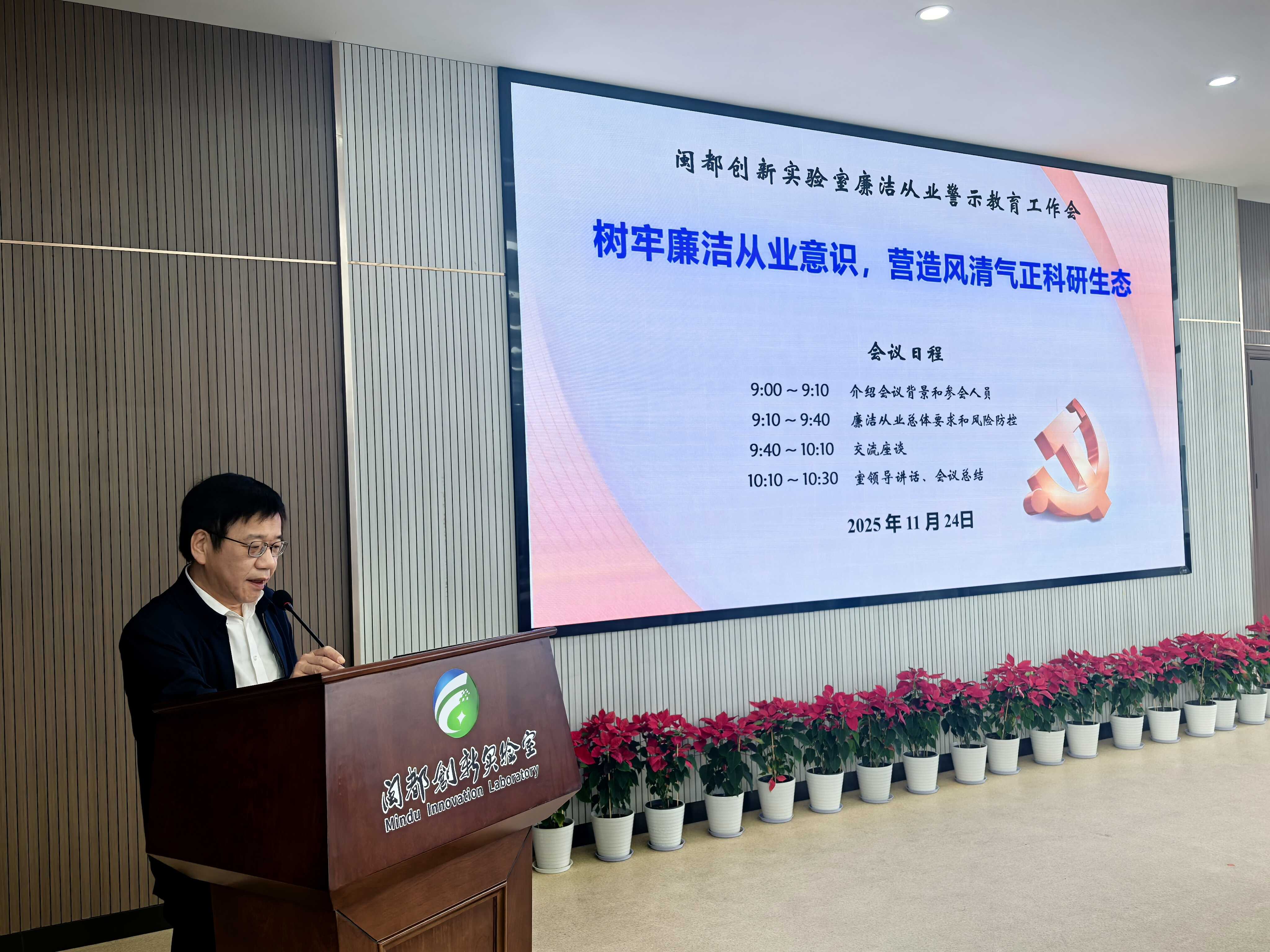 为进一步加强廉洁从业和科研诚信建设,增强纪律意识、规矩意识,营造风清气正的科研生态,2025年11月24日上午,闽都创新实验室召开年度廉洁从业警示教育工作会。实验室全体职工以及设备管理员、财务报销员等关键岗位人员参加会议,会议由实验室党总支书记程华琴主持。